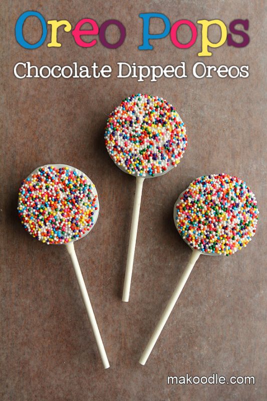 12. Oreo Pops: Dip Oreos in chocolate and cover them in colorful sprinkles to make these tasty pops from Makoodle!