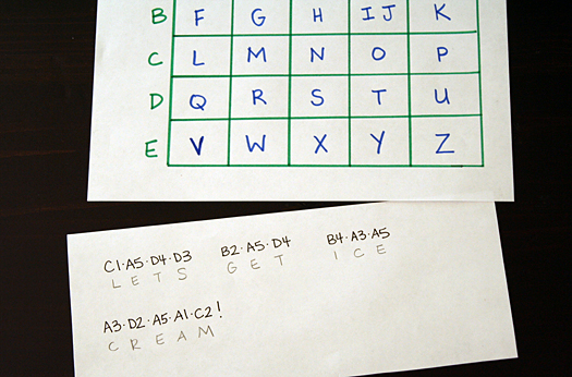 A grid secret code is easy to set-up, and is great practice for using coordinates, too. Each letter is represented by a row letter (A-E) and a column number (1-5). Two letters have to share a space – I chose I and J, since they would not be easily confused in a word. We found that grid codes take a little extra time to write, but are quick to solve.