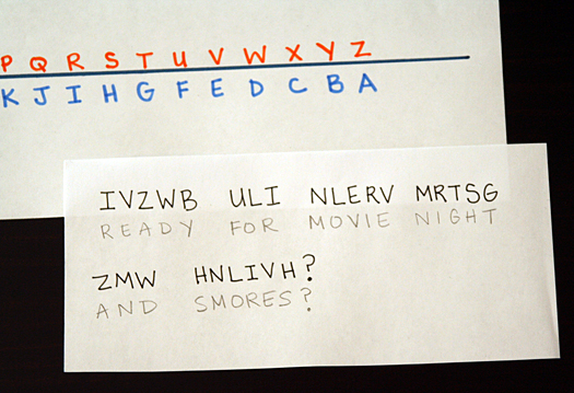 Here’s a simple reverse alphabet code to start with. Write the alphabet on your paper, then write it backwards directly underneath your letters. To write your message, look at the top (orange) letters and write the bottom (blue) letters. To decipher it, find the letters on the bottom line, and write the corresponding letters from the top line.