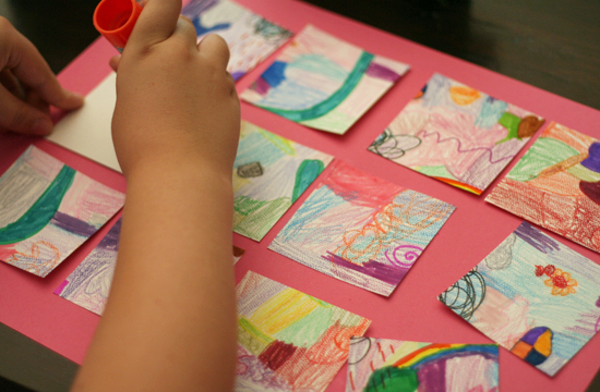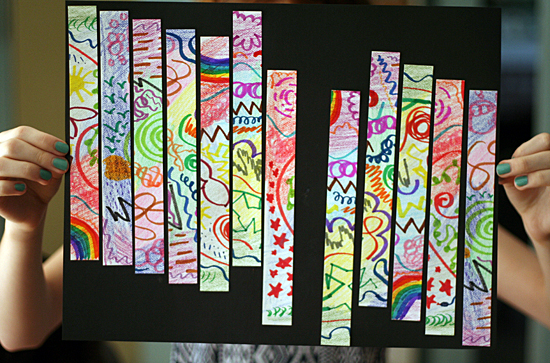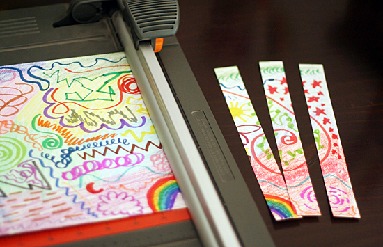 When your artwork is complete, it’s time to cut it up! If you used paints, make sure you let your project dry completely before cutting. Cut your paper into strips, squares, or rectangles. Natalie chose to cut hers into 1″ strips, and Delaney went with 3″ squares. I cut these with a paper cutter, but you could also draw lines on the back and cut with scissors.
