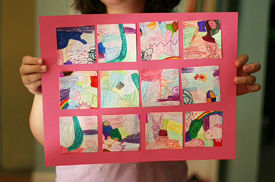You’ll need a larger piece of paper for your background. Our drawings were on 9″x12″ paper, so we used 12″x18″ construction paper for our backgrounds. The background paper was a little bit long, so I just trimmed a couple inches off one side. Mix up your pieces and start arranging them on the background.