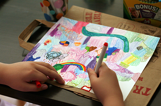 My girls used markers and crayons, filling their pages with doodles, shapes, and random patches of color. A heavier paper is nice, but not necessary unless you are using watercolors or other paints. They had a lot of fun making their art look as crazy as possible!