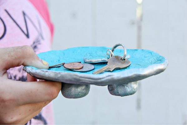 Allow to dry, and then apply a coat of Testors Craft 3oz Aerosol Glitter Sealer. That way dad doesn’t have glitter on his keys, money, gum, or whatever else ends up in that catch all.
