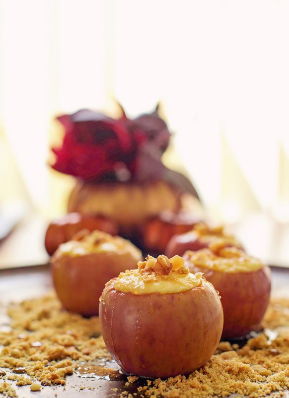 6.Serve cheesecake stuffed baked apples at room temperature or chilled, topped with caramel sauce, some crushed graham cracker and chopped walnuts.