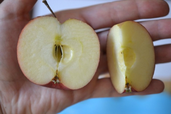 Now you are ready to make your crab! Squirt some red paint on a small paper plate. Take your apple and cut it half with your knife. Now take one apple half and cut it again, in half.