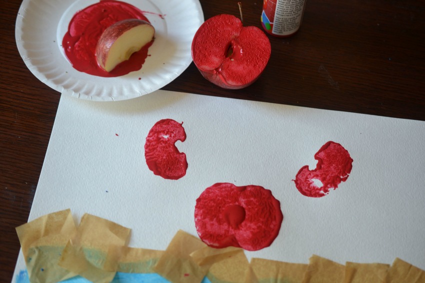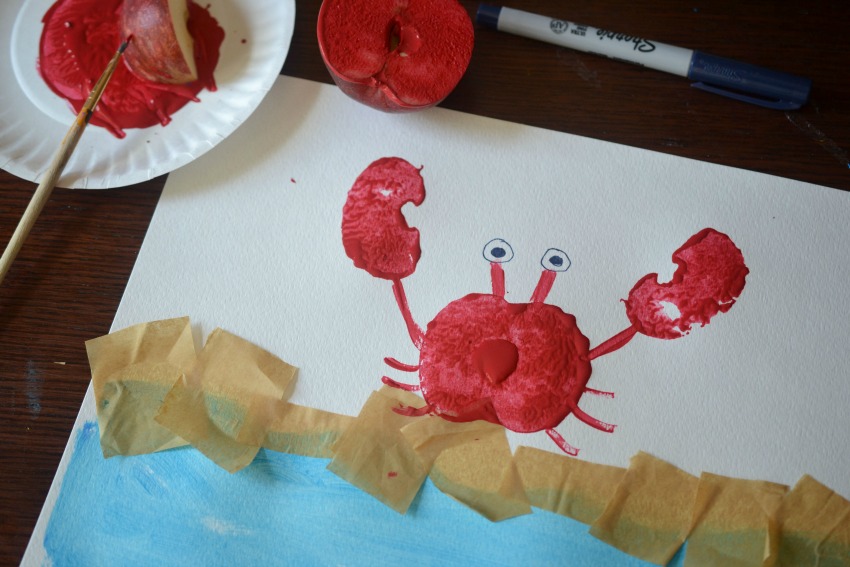 Take the large apple half and rub it in the red paint, until it’s completely covered. Press it down on the center of your “beach” scene. Now grab your smaller apple half, dip it in red paint and press it down on the cardstock twice, for the crab’s claws.