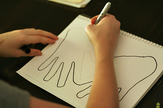 Start by tracing your child’s hands upside-down on the page, with thumbs and pointer fingers touching to form a heart shape in the center. I traced their hands with pencil, and they traced over the lines with marker or oil pastel.