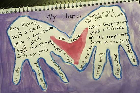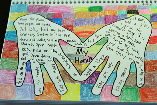 Now, fill the inside of your traced hands with words, phrases, or sentences about all the things you can do with your hands. Big kids can write their own words, and littles can draw pictures or dictate their words to a grown-up. Some of my favorite things the girls came up with: flip pancakes, grab a rope swing, play guitar, and give high-fives.