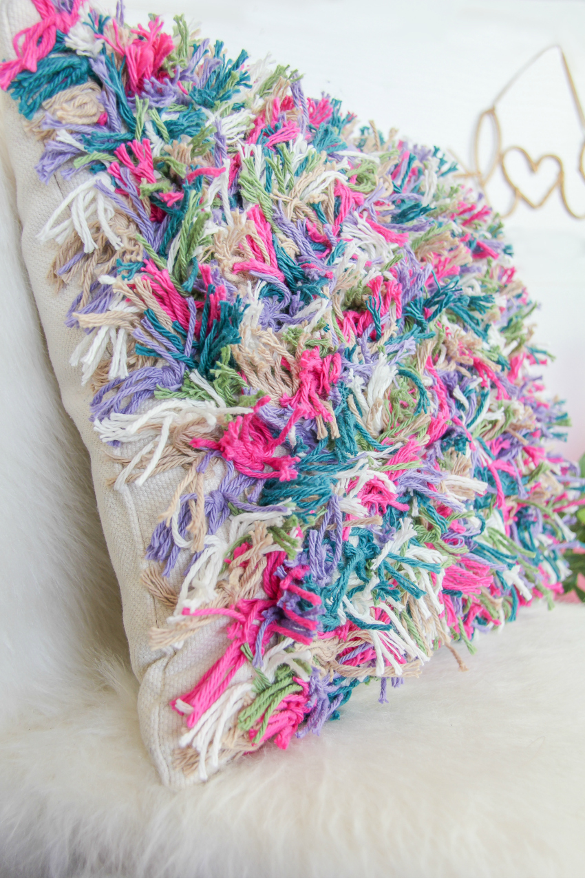 My favorite kind of craft projects are yarn crafts, especially those I can make to decorate our home. There’s something so warm and comforting about yarn projects around the home whether they are wall hangings, home decor, or throw rugs. This bohemian style shag cushion will be the perfect addition to your home.