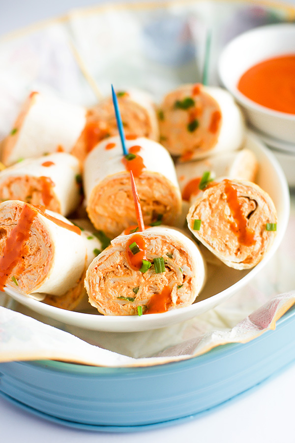 You only need some shredded chicken meat, cream cheese, flour tortillas and of course buffalo sauce. That’s it! Before you know it, you are sitting in front of a big bowl of buffalo chicken mixture. Try not finishing it before making these adorable pinwheels. Just spread the filling into a tortilla, roll and slice! How easy is that? Read on for the full recipe and instructions for this delicious and fresh summer recipe.