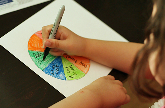 After your wedges are colored, write your activities on the spinner. We used a black Sharpie for writing. For little ones, do the writing part for them, or have them draw pictures for each activity.