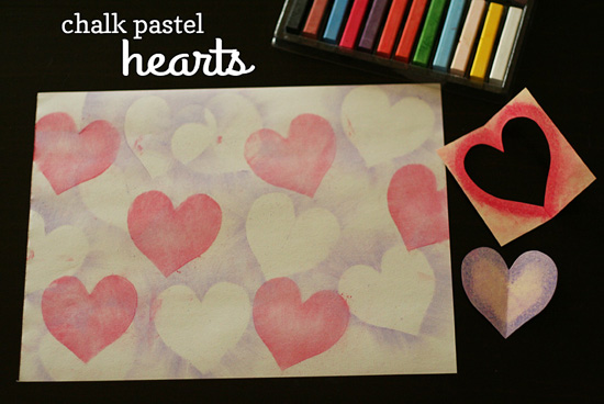 I recently picked up a box of chalk pastels at the craft store, and we finally decided it was time to break them in with some Valentine-inspired art. Using a simple stencil and chalk pastels, we created these fun pictures with a random design of positive and negative heart shapes. All the coloring and smudging is great work for little hands, too! Let’s get to creating…