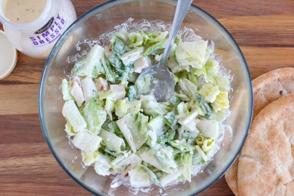 In a small bowl, mix up your chicken, lettuce, cheese, and caesar dressing. Set aside