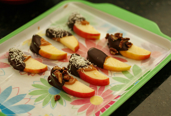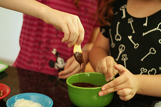 My girls had quite a system going – they took turns tipping the bowl to make it easier to dip the apples into the chocolate. When all your slices are dipped in chocolate, put the tray in the refrigerator for 5-10 minutes to let the chocolate finish hardening. It’s hard to wait, but so worth it. Just lick the chocolate bowl clean while you are waiting!