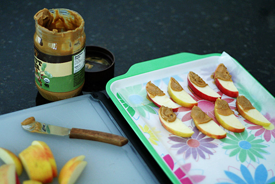 Slice an apple (or two or three) and spread peanut butter on half of each slice. I like leaving the other half of the apple slices plain to use as a handle. If your peanut butter is hard to spread, scoop some into a dish and microwave it for a few seconds to soften it up. Lay the peanut buttered apple slices on your prepped tray and stick in the freezer for 10-15 minutes.