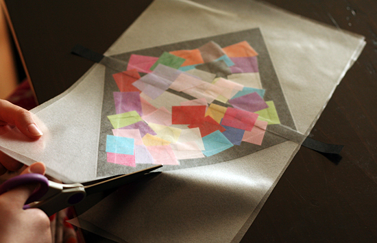 When your kite shape is completely covered with tissue paper, seal with another piece of clear Contact paper. For best results (less wrinkles and trouble), stick the cover sheet to one end and slowly smooth it down over the tissue paper.