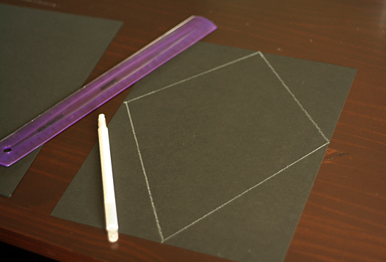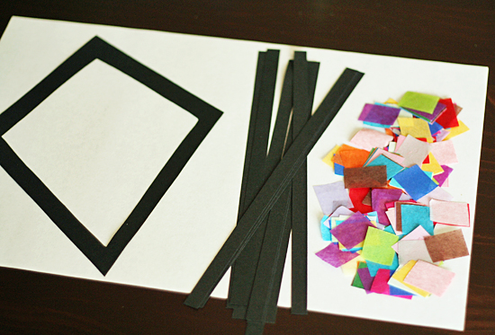 You’ll need to do a little prep work to get this project ready for your young crafter. Cut a kite-shape from black construction paper. Then, cut out the center of the kite, leaving about a 1-inch frame.