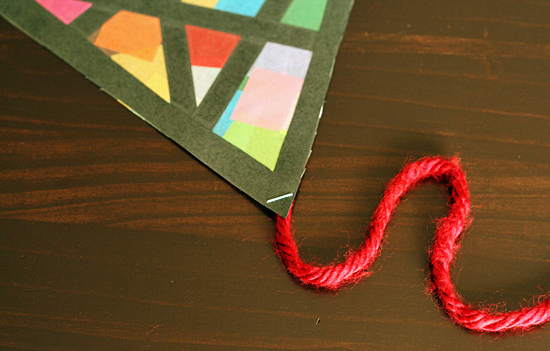For the tail, staple a piece of yarn or ribbon to the bottom of the kite. We also added a few construction paper flags to our tail – cut out a simple bow tie shape and staple to the tail.
