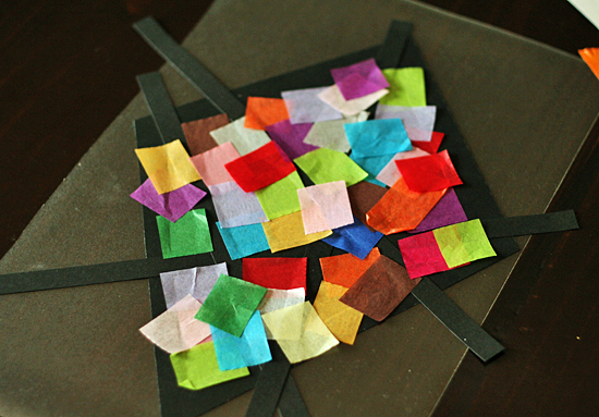Tape a piece of clear Contact paper, sticky side up, on the table. Stick your kite frame down and create a design with black paper strips or shapes. You could do traditional cross-shape strips, or something of your own creation. One of my girls did an abstract line design, and the other cut out a few black hearts for her design.