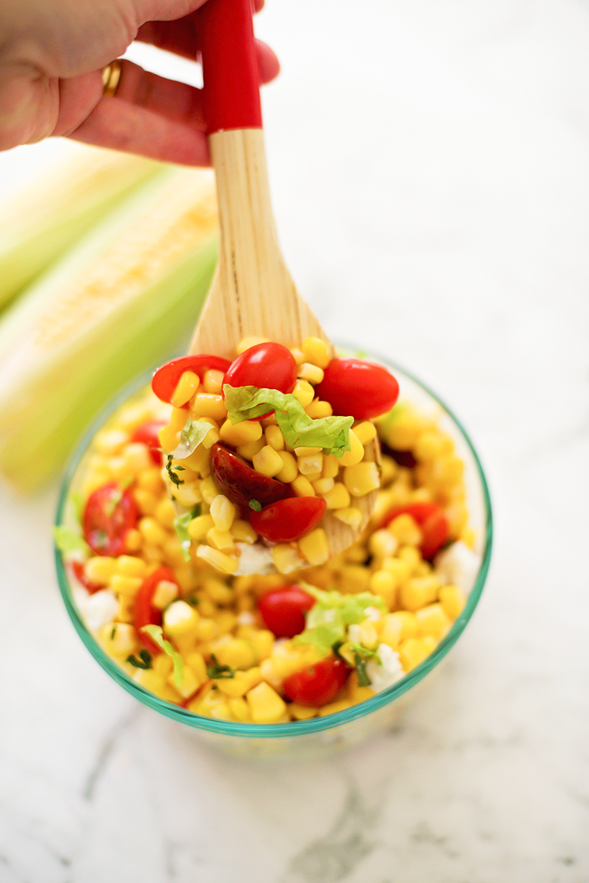 This Easy Summer Corn Salad brings together all favorite summer flavors: sweet corn, fresh and juicy tomatoes, feta cheese, fresh herbs from the garden and a light salad dressing.
