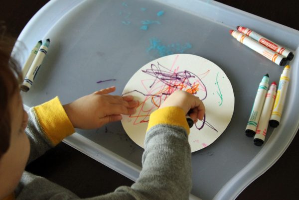 Color all over the paper circle with the washable markers. Any kind of marks will work – scribbles, dots, squiggles, big patches of color, etc. Use as many colors as you like!