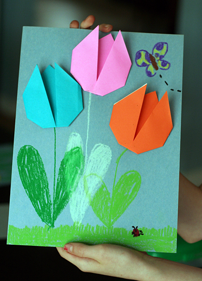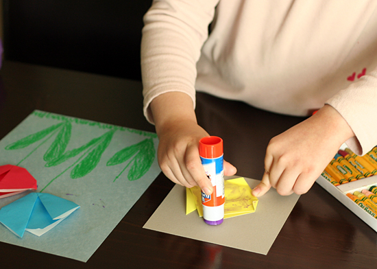 Once they had finished drawing, they used a glue stick to attach their origami tulips. Be sure to put extra glue on the little flaps on the back. Even after gluing down, the tulips still pop up a bit for a 3-D effect.