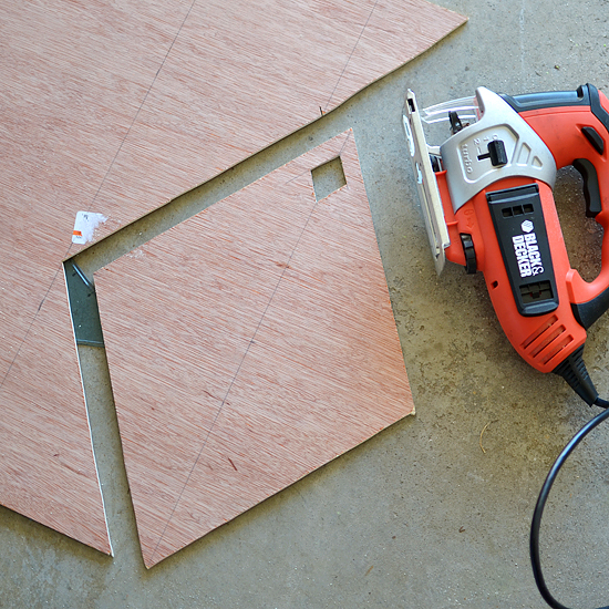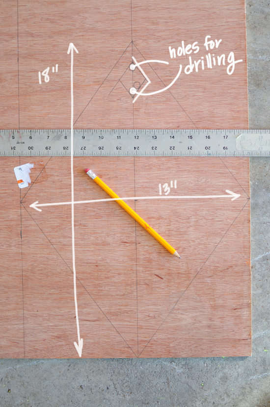 Drill your pilot hole and cut out the middle hole. If you have a big enough bit, you could just skip the inner diamond and just go with a drilled hole. There’s no right or wrong way to do this. Then you’ll slowly cut out the diamond from your sheet of wood. I used a sturdy garbage can to hold the wood up to cut. If you have a sawhorse, use that.