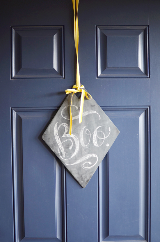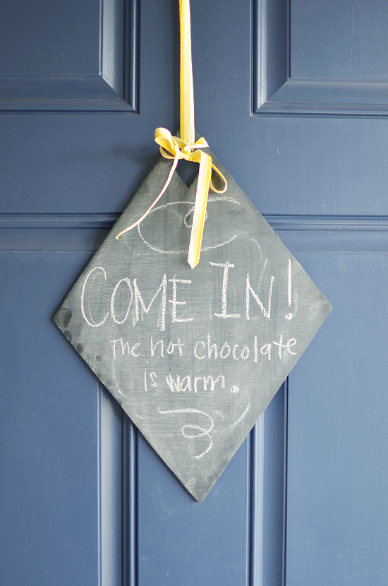If you have lots of wind in your area, you’ll want to put felt cushions on each corner of your chalkboard plaque to keep it from damaging the paint on your front door. And now you’re done!