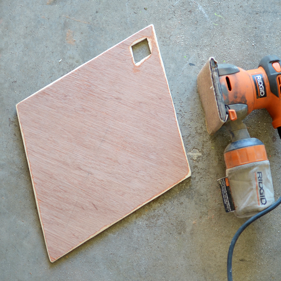 You’ll definitely want to sand next! I used a veneered plywood, so the edges were a bit rough. I smoothed down those edges and the surface. You’ll want to sand down your piece even if you use MDF. Sanding will help paint adhere and create even coats. I used 220 grit sandpaper.