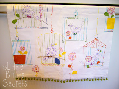 These are plain tea towels in bright colors and machine-appliqued simple designs on each. We added embroidery, some buttons, a bit of ric rac, and a pom-pom trim to finish them off. Very chic. And nonchalant. Very Anthropologie. For a lot less.