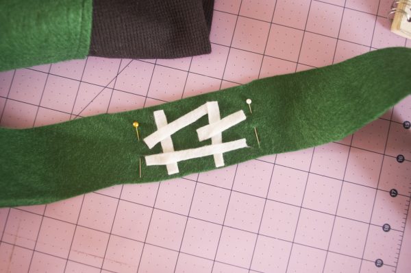 6. Measure the bottom hem of your shirt and cut a rectangle from green felt that is 2.5” wide and the length that you measured (mine was about 13”). Pin to shirt.