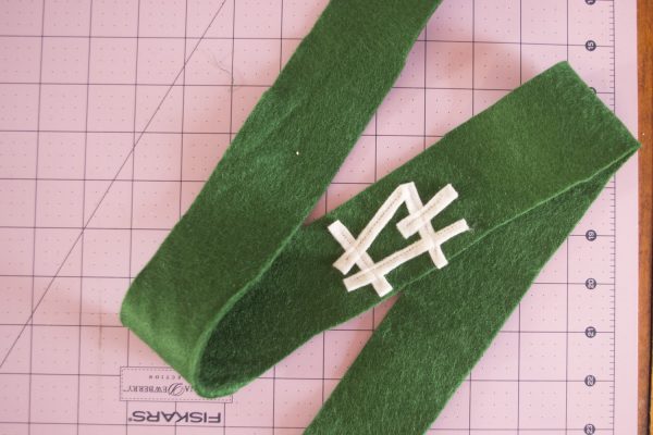4. Cut a rectangle from the green felt that is 34” by 2”. Cut 5 skinny long rectangles from white felt (no longer than 1.5” and arrange in the shape shown. Stitch to middle of green band. This is your headband. Simply place over the hood and forehead and knot in back of head.