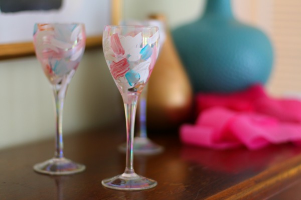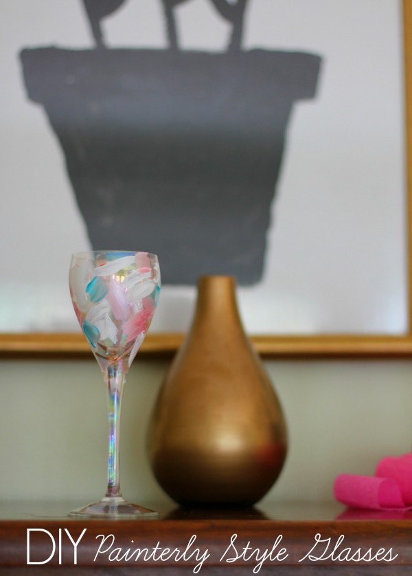 Recently, I’ve found a bit of a solution and a great use for my “fancy” glasses: I turn them into votive holders! So, I experimented with glass painting and I played around with some techniques to give my “fancy” glasses a little colorful personality. I painted the glasses painterly style and then popped some candle votives inside. The result definitely channeled my inner-child-of the-80’s and made the room smile.