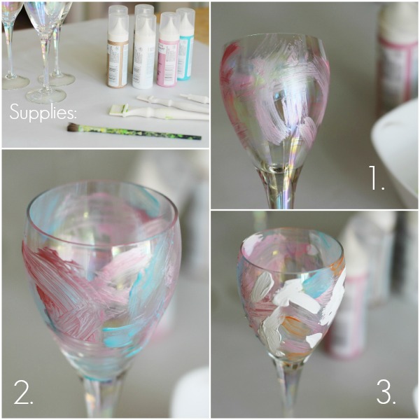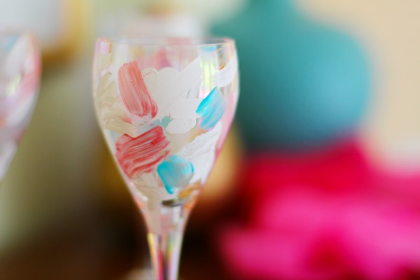 I chose four paint colors for my glasses: pink, orange, turquoise and white. I first distributed a small amount of each color into a shallow container. I started with pink and I dipped my brush into the paint and painted directly on the outside of the glass in random strokes in a “painterly” style.