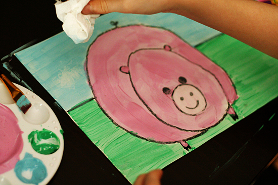 Mix-up a nice piggie pink color for painting. We also mixed a slightly lighter pink for the snout. Paint your pig! It’s okay if you paint over your black lines – you can always darken them again when your painting is dry.