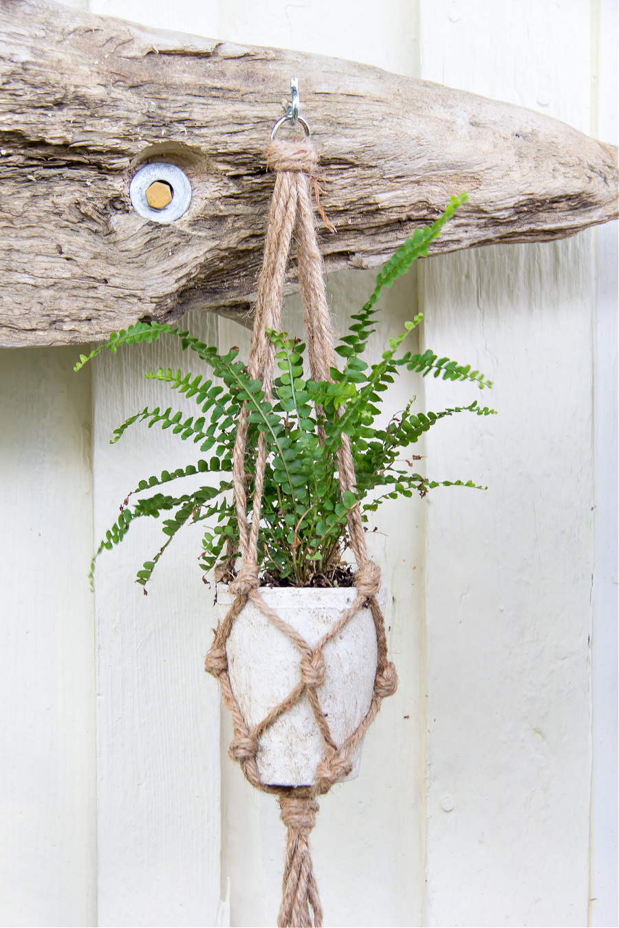 We used a very similar method for hanging the next planter as well. A smaller woodboring spade drill bit was used to make a hole large enough to thread hemp cord through. I used four strands of hemp cord to make this hanger with one knot being tied underneath the planter and a second above the hole in the driftwood.