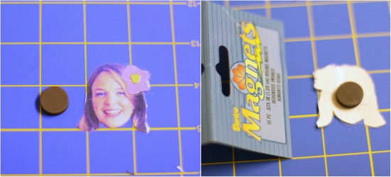 Next, using your hot glue gun, add a little dab of glue to the back of your face and glue on your magnet.
