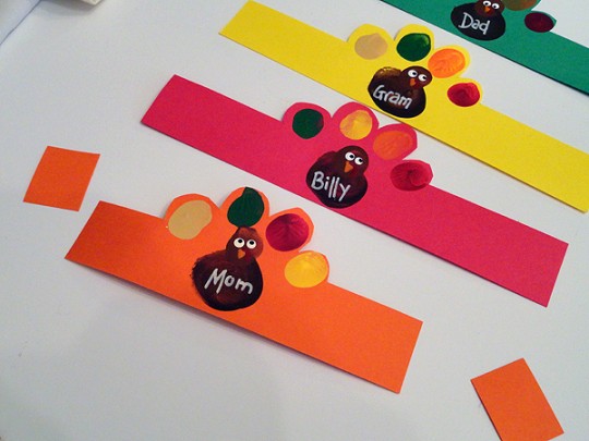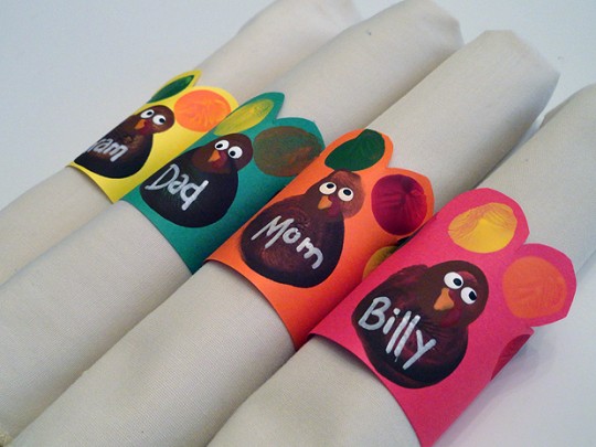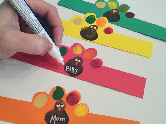 Fingerprint Turkey Napkin RingsUse white paint pen to write your guests’ names on the turkey’s body.