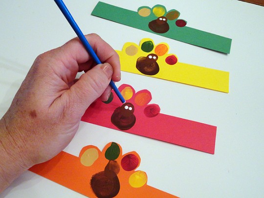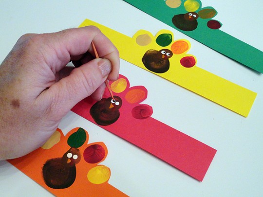 Fingerprint Turkey Napkin RingsWhen dry, use the handle end of a paintbrush to add white eyes.