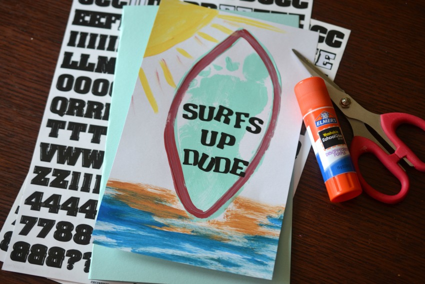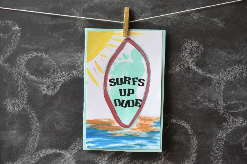 To finish the Footprint Surf Board – trim up the cardstock to fit on a card front, glue it on and add stickers that say “Surfs Up Dude!” Then display and/or gift proudly!