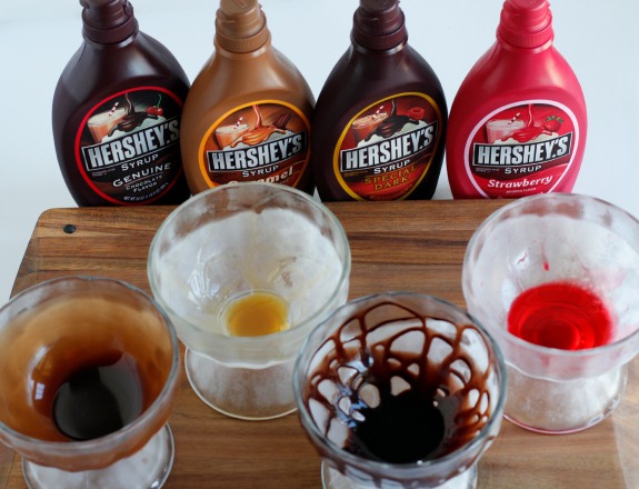 1. Grab your ice cream dishes and set out flavors of syrup. Add syrup to the bottom and sides of your dish. You can see that we did it two ways: drizzle all over in lines or pool it at the bottom and roll it around to get it all over the whole dish. Both ways work great!