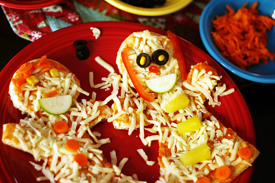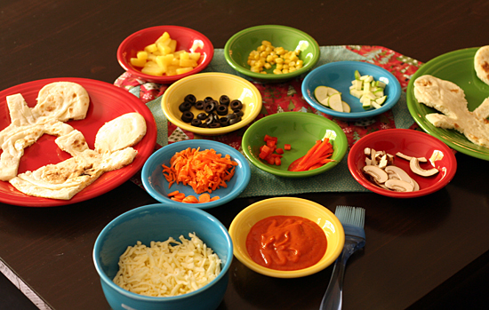 Set out your sauce, cheese and assorted toppings and let the kids go to town. You can cut the veggies into a variety of shapes - strips, rounds, half-moons, small dice, and grated.