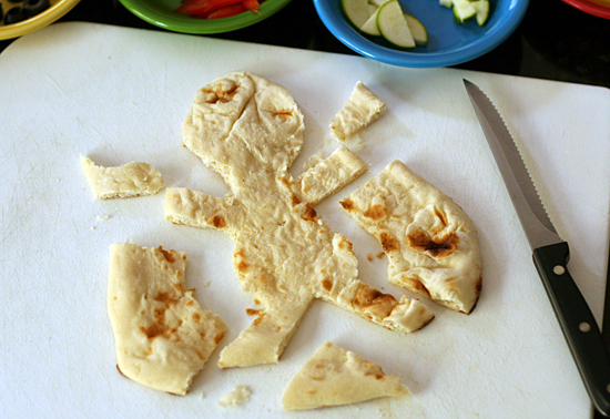 Cut your crust into boy and girl shapes, or use a large cookie cutter if you have one. I just winged it, and my girls certainly didn’t mind my imperfect shapes!