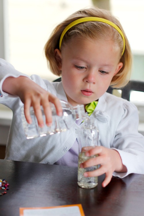 Anna loved learning all about the lava lamp, sparkly sequins was a plus! She started to read some of the words for the instructions and followed along.