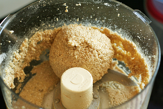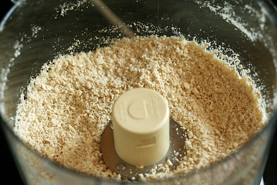 Step 1: Add cashews and oats to a food processor and pulse until you get a flour-like consistency. You don’t want to make cashew butter, but you don’t want any big chunks either.