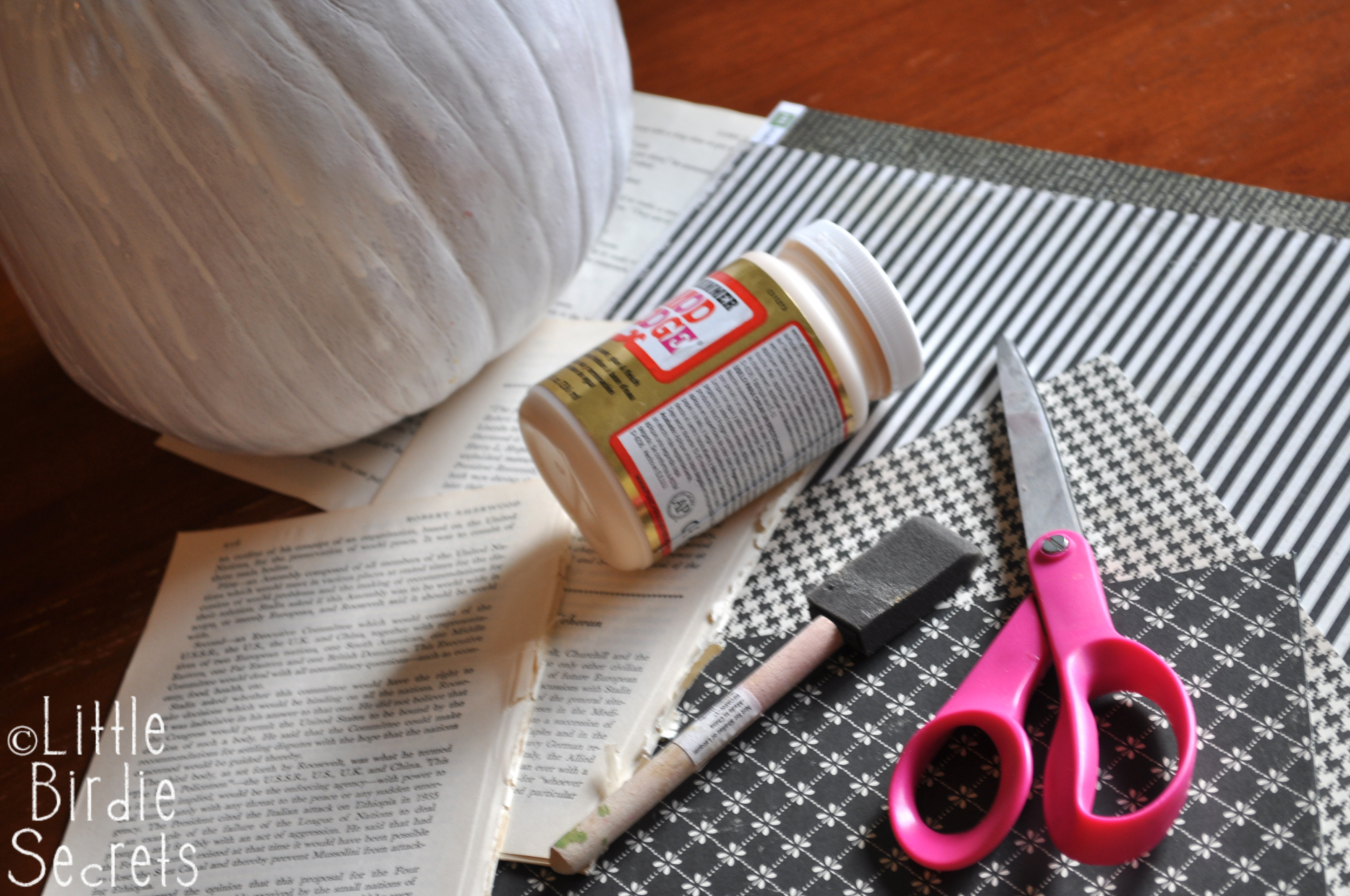 4. Continue with your strips of book paper until the entire pumpkin is covered.
