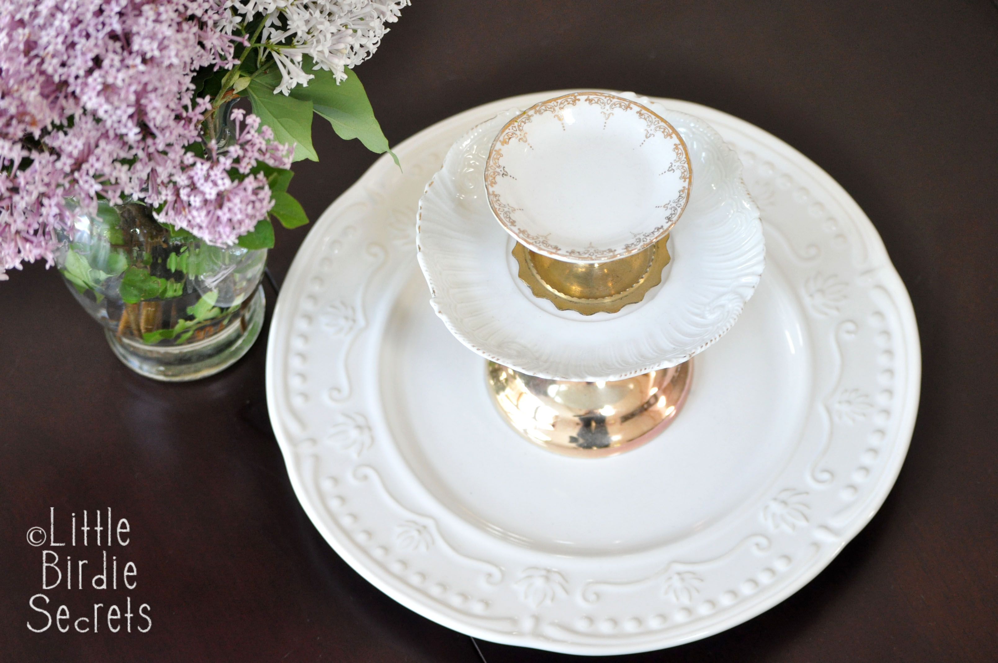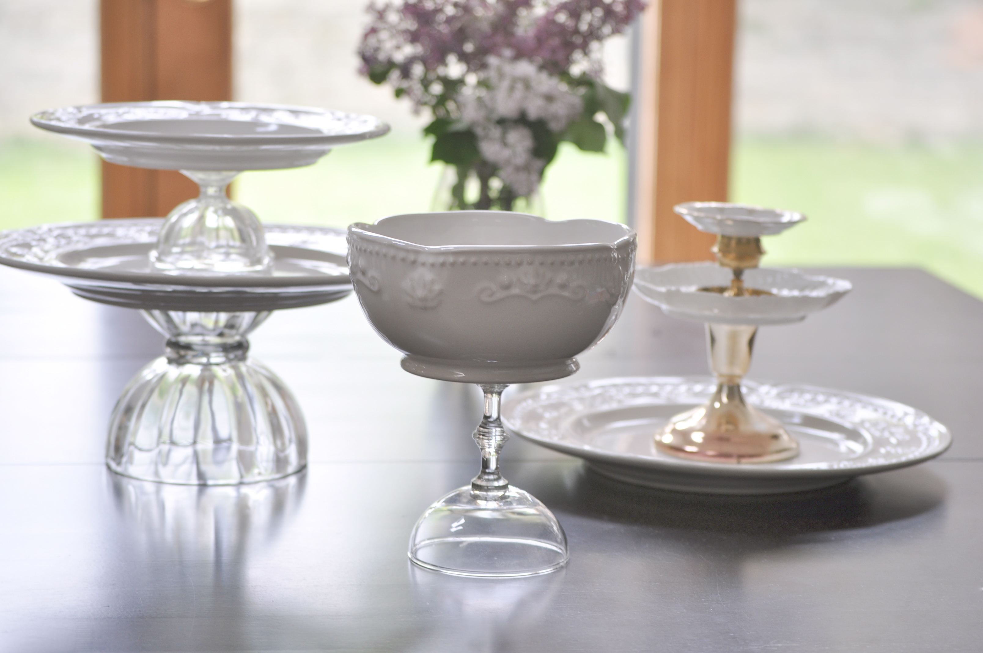 Recently I gave you a simple yet chic idea for transforming plain glass vases into perfectly coordinating pieces for any entertaining theme. I’m so into cheap and easy these days, I thought you might like to know my other secret for presto change-o partyware: build-a-tiered-serving-plate out of any dish!
