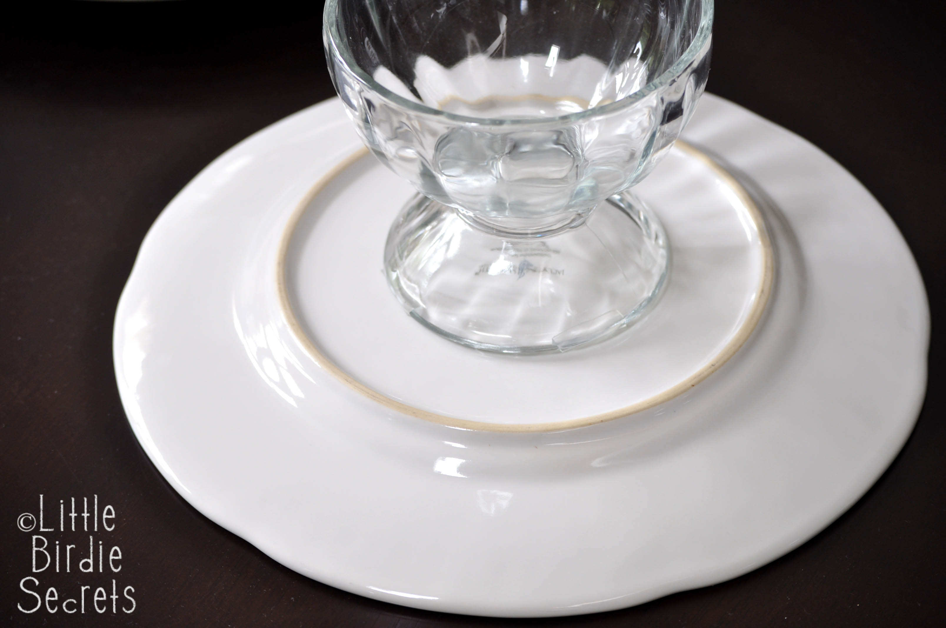 1. Start with a small sherbet cup, glass, or candlestick. Be sure it is steady enough (i.e. has a wide enough base) to support your plate.