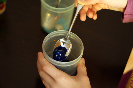 Choose your paint colors and put your paint in cups. You don’t need a lot of paint, just enough to get your jingle bell coated. Choose colors that will look good together when mixed – too much red and green together will make brown! We went with two shades of blue plus some shiny gold.