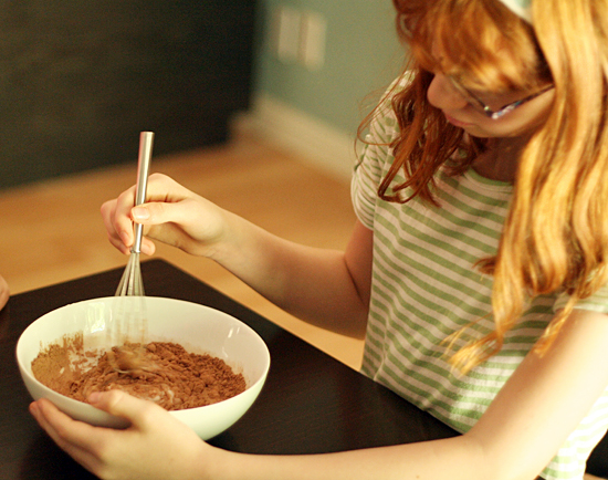 There are not many steps to this recipe – just dump your ingredients in a bowl and mix until smooth. We found a wire whisk worked the best for getting out all the lumps. Mix and mix till smooth, then taste for sweetness and chocolatey-ness.
